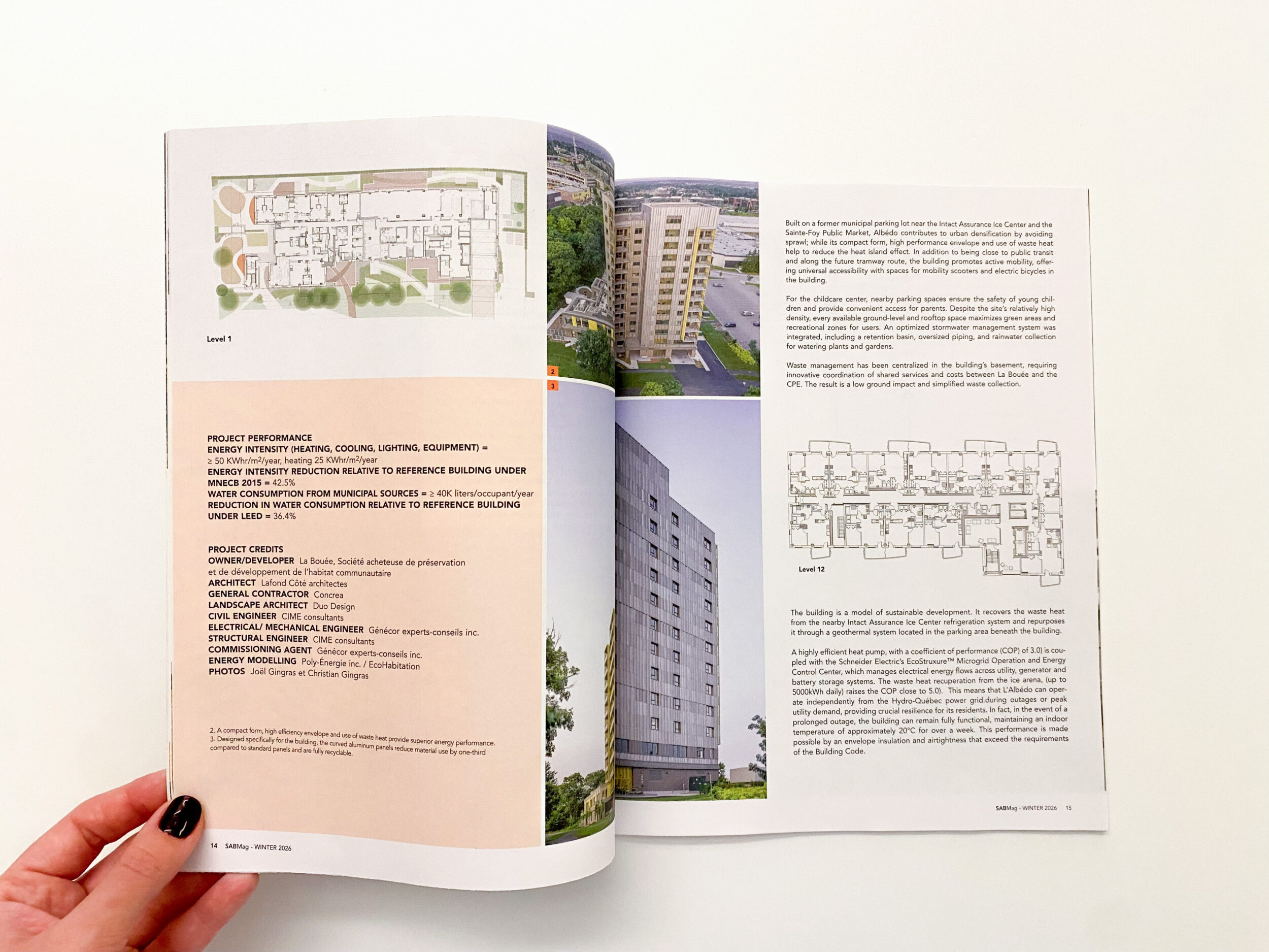 Au-delà de sa portée sociale, L’Albédo se distingue par son audace technique et environnementale. Grâce à une enveloppe hautement performante, à des systèmes mécaniques efficaces et à la récupération de la chaleur du Centre de glaces Intact Assurance, intégrée à un système géothermique avancé, le bâtiment atteint une réduction de 34 % des émissions de gaz à effet de serre sur l’ensemble de son cycle de vie. Son revêtement d’aluminium bombé sur mesure, 100 % recyclable, réduit de 30 % la matière utilisée. Conçu selon les normes Novoclimat et certifié ISP (indice solaire passif), l’immeuble peut même fonctionner de manière autonome lors des pointes énergétiques ou de pannes grâce à son micro-réseau intelligent. Lauréat du prix 2025 du Conseil du bâtiment durable du Canada, L’Albédo incarne une nouvelle génération de bâtiments où résilience, confort et qualité de vie convergent. Sa mise en lumière dans un magazine d’architecture confirme la portée distinctive du projet : un lieu de vie profondément humain, inclusif et durable, qui démontre que le logement social peut être à la fois ambitieux, innovant et exemplaire.